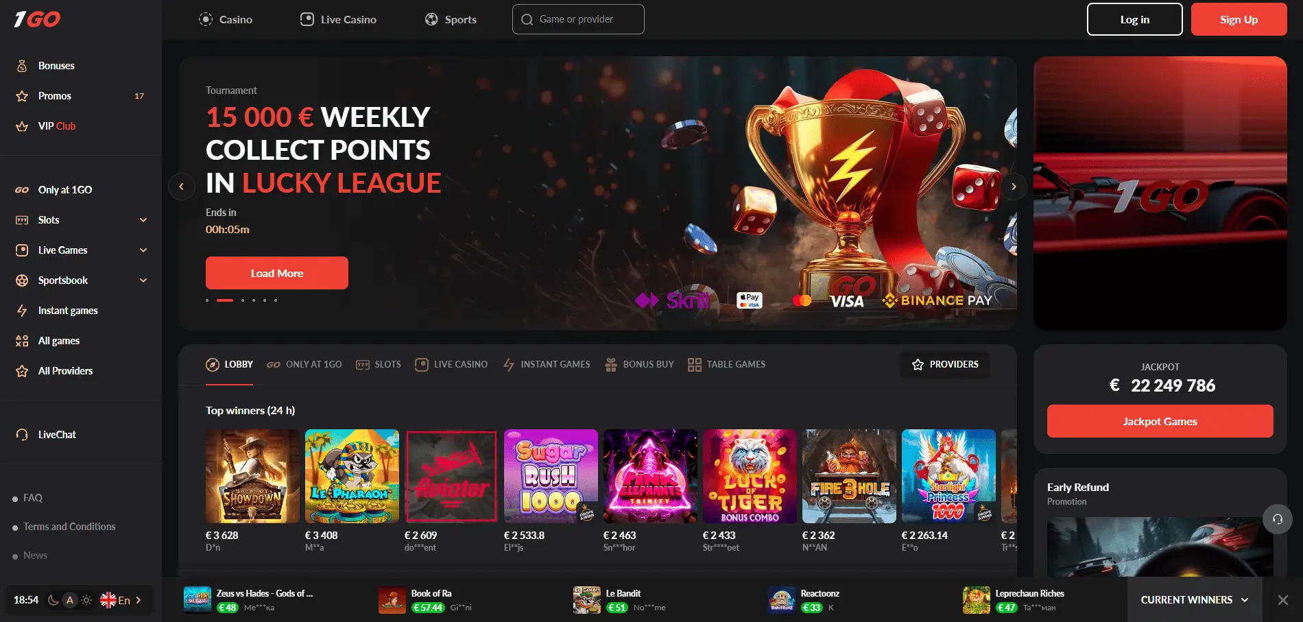 1Go Casino ir salīdzinoši jauns tiešsaistes kazino, kas piedāvā plašu spēļu klāstu un dažādas akcijas, lai piesaistītu spēlētājus. Atsauksmes par šo kazino bieži vien izceļ tā lietotājam draudzīgo interfeisu un vieglu navigāciju, kas ļauj spēlētājiem ātri atrast savas iecienītākās spēles.