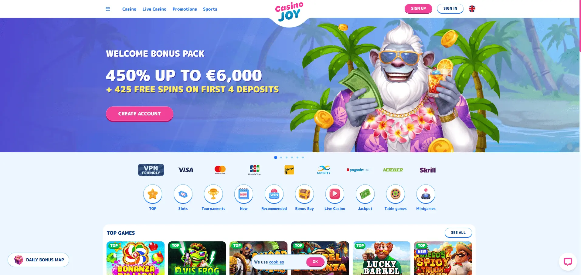 Casino Joy piedāvā vienu no dāsnākajiem sagaidīšanas bonusiem tiešsaistes azartspēļu pasaulē – līdz pat 6000€ bonusā un 425 bezmaksas griezienus.