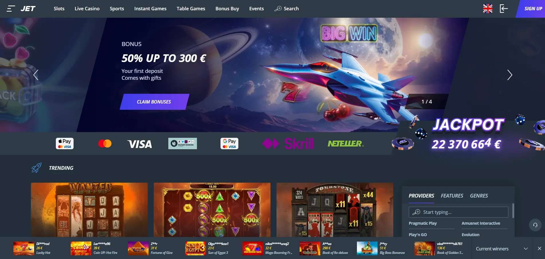 Jet Casino ir dinamiska tiešsaistes azartspēļu platforma, kas piedāvā plašu spēļu klāstu, konkurētspējīgus bonusus un ērtu lietošanas pieredzi.