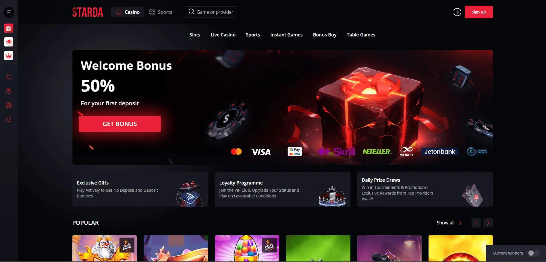 Jaunie spēlētāji var saņemt sagaidīšanas bonusu – piemēram, 100% bonuss līdz 600 € + bezmaksas griezienus, kas padara startu kazino pievilcīgu. Papildus tam Starda piedāvā dažādas akcijas un lojalitātes programmas, kas motivē spēlētājus atgriezties un aktīvi iesaistīties. - Maksāšanas metodes