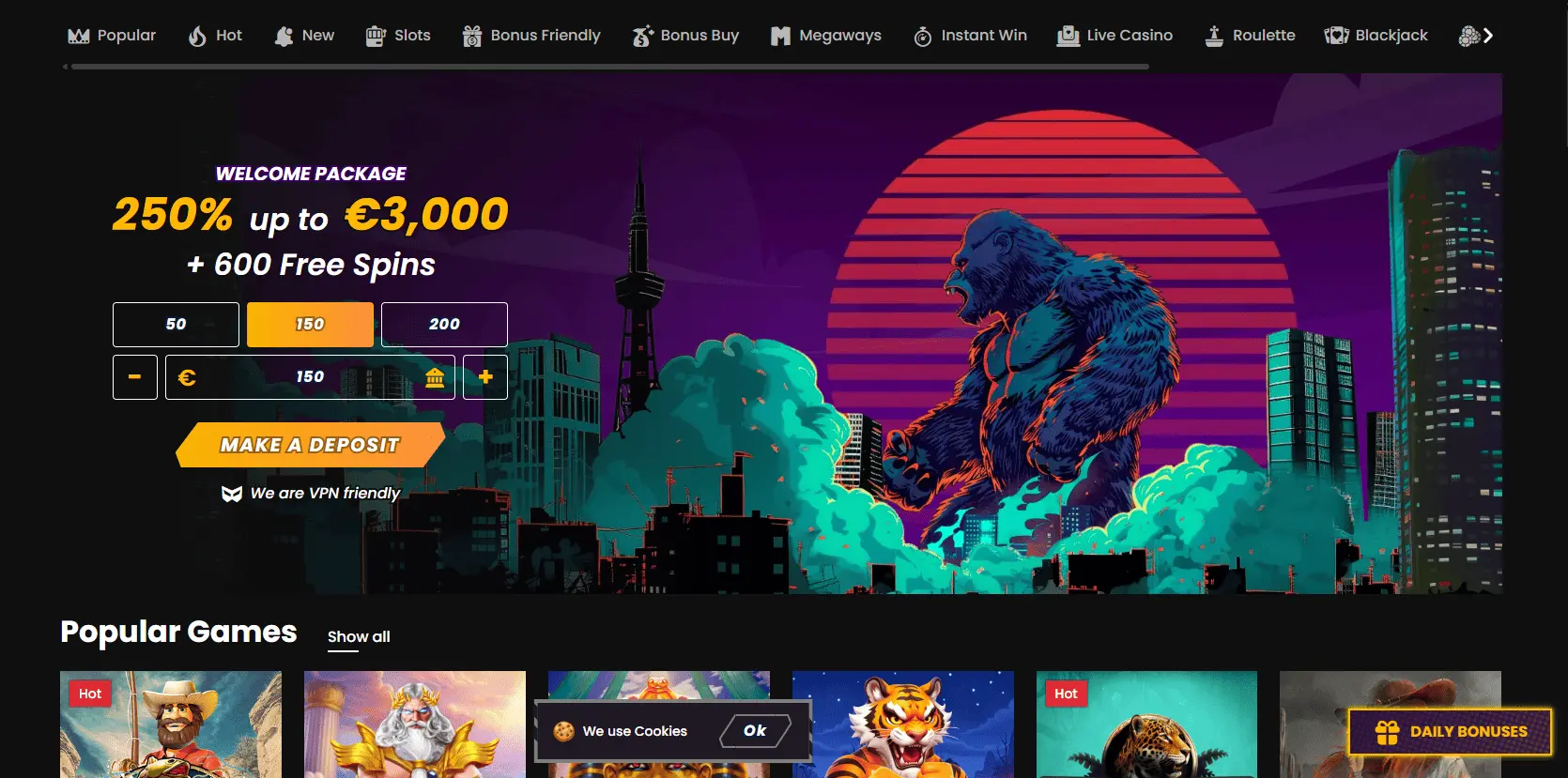 - Viesmīlības bonuss: Jaunie spēlētāji var saņemt dāsnu viesmīlības paketi, kas parasti ietver bonusu līdz 500 € un 150 bezmaksas griezienus pirmajos trīs iemaksās.